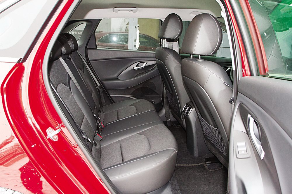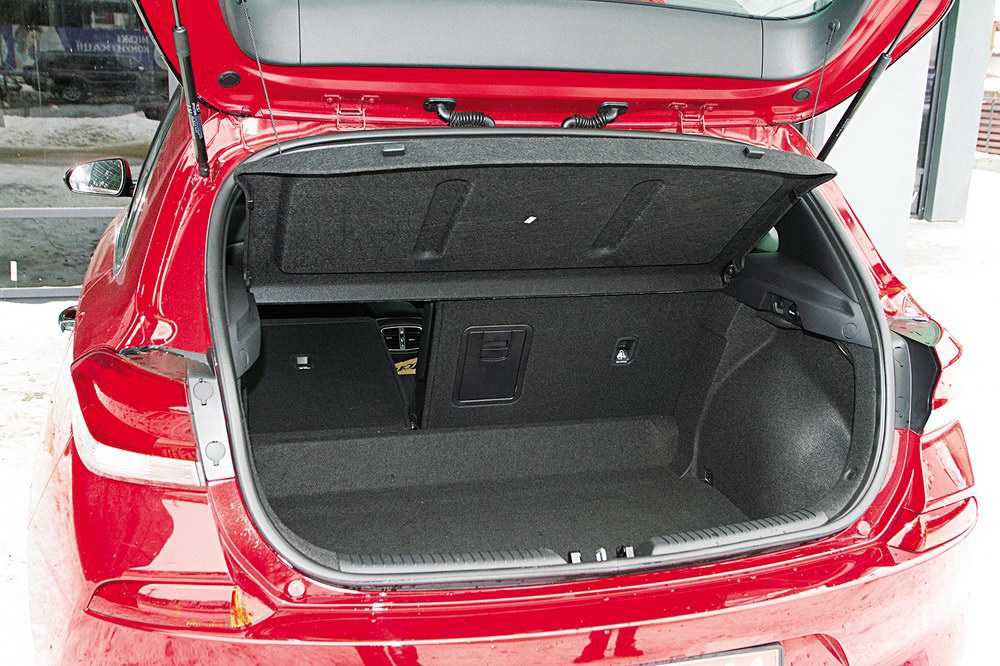 Редко какой хэтчбек обладает вместительным багажником, и i30 не исключение. Чтобы выжать по максимуму пользы при куцем свесе кузова, конструкторы как можно ниже опустили пол «трюма», положив в него плоский блин докатки. В итоге получились вполне приемлемые 395 л, однако вот что более всего обидно: задние сиденья не складываются вровень с этим фальшполом, а выступают ступенькой эдак в 15 см. Как компенсацию, Hyundai предлагает лючок для длинномеров посредине.