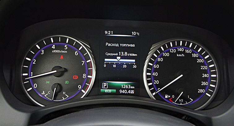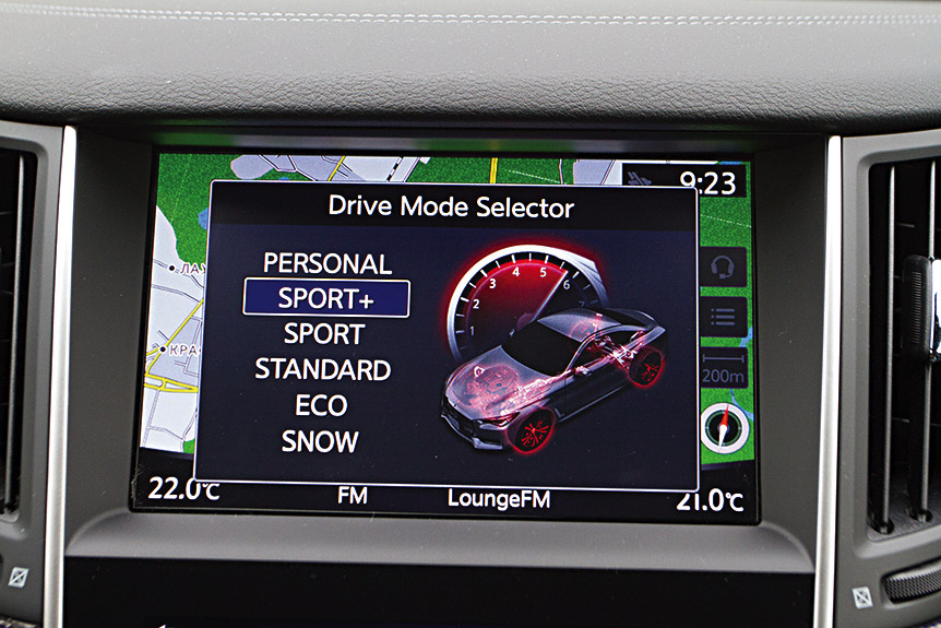 Кстати, о режимах. Infiniti Q60 – тот нечастый случай быстрого автомобиля, в котором не хочется побыстрее переключиться в Sport или Sport+. Благодаря ровному характеру мотора, развивающего максимум тяги уже чуть ли не с полутора тысяч оборотов, и расторопности 7-ступенчатого автомата, режим Standard оказался совсем не грустным. Даже наоборот.