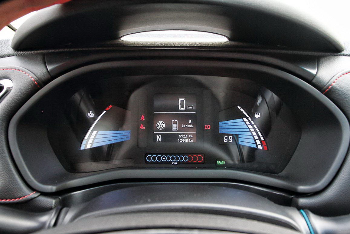 Комбинация приборов – полностью электронная и своеобразная по стилю. На ней четыре отдельных дисплея. Трип-компьютер и заряд батареи – это понятно; «пауэрметр», показывающий мощность разгонной тяги и рекуперативного замедления, тоже логичен. Но так ли нужен мне указатель температуры батареи? Думаю, для этого параметра было бы достаточно одной сигнальной лампы, на случай опасного теплового разгона.