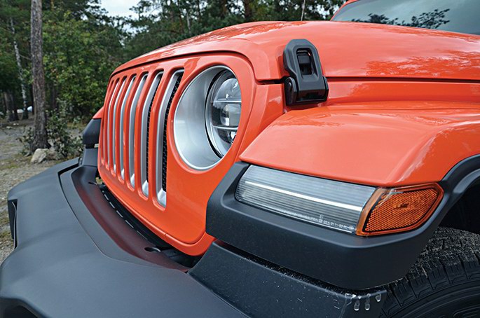 Почему нет ощутимой экономии в загородном цикле? Видимо, сказывается аэродинамика кирпича, которая все еще свойственна Рэнглеру. Ведь ни форма, ни габариты кузова не изменились. Разве что радиаторная решетка слегка выгнулась назад, а ее наружные планки теперь мягко обтекают фары. Которые, в свою очередь, за доплату могут быть светодиодными. В передние крылья вживлены ходовые огни и указатели поворотов – вот вам самые явные внешние отличия нового Рэнглера от дореформенного.