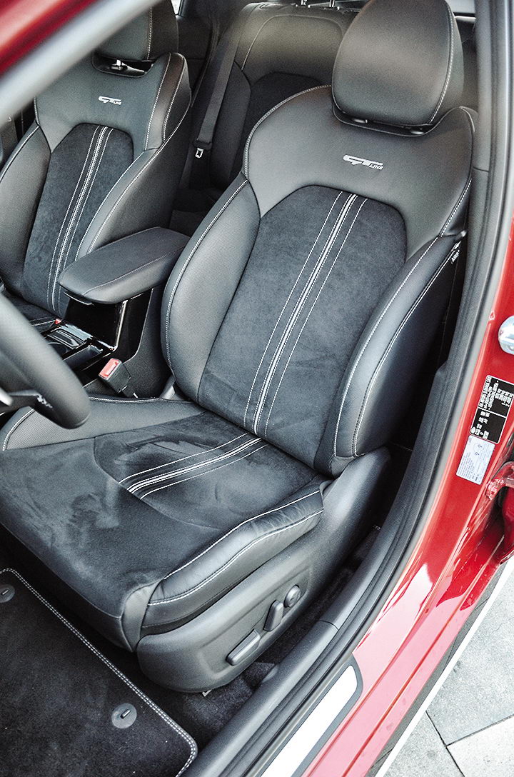 Хотя дизайнеры Kia сделали все, чтобы нивелировать внешнюю разницу. У GT и GT Line чуть разнится оформление воздухозаборников, радиаторной решетки (в случае GT ее ячейки обозначены крошечным шильдиком и подкрашены красным), порогов и колесных дисков (у GT они подчеркнуты изящными вкраплениями того же красного). Если присмотреться, можно обнаружить легкие отличия в оформлении заднего бампера.