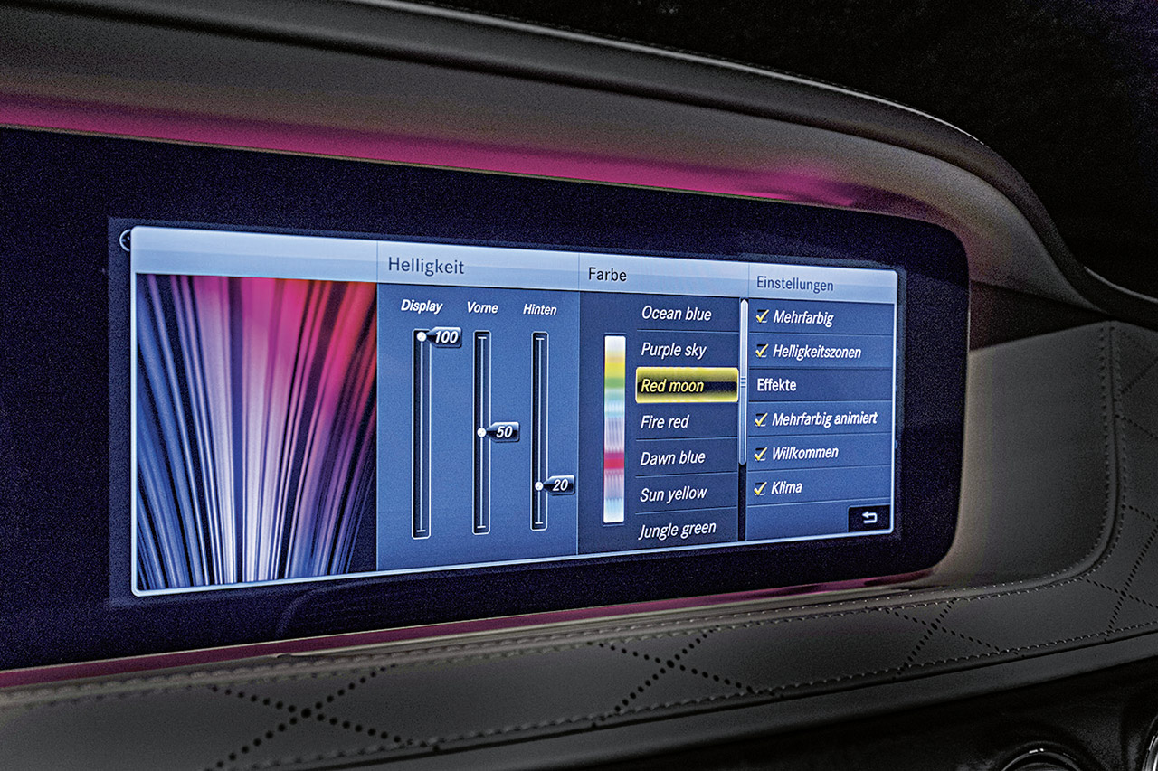 А еще в зависимости от выбранной программы S-Класс сам подберет музыку, ориентируясь на ее ритм. Изначально в бортовую систему заложено по одной мелодии на программу. Но если водитель подключит к мультимедийной сети, скажем, телефон с набором любимых композиций, автомобиль покопается и в нем, выбирая самую подходящую мелодию.