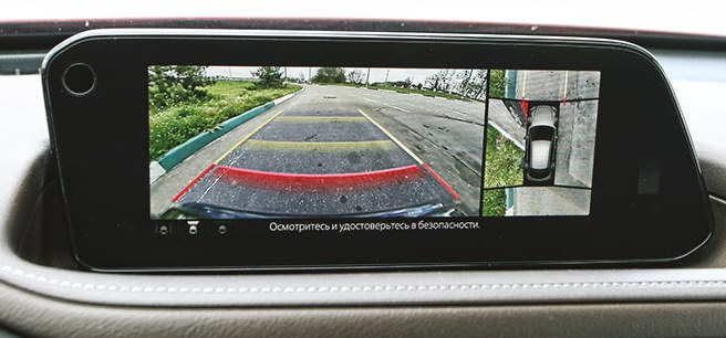 Систему кругового обзора можно получить только в топовой комплектации Premium, но получить стоит: еще буквально год назад о таком качестве изображения в автомобилях Mazda не приходилось и мечтать. Имеется выбор видов и углов: сверхширокого угла обзора назад или, скажем, вида слева и справа на уровне передних колес. Камеру можно активировать нажатием кнопки на руле