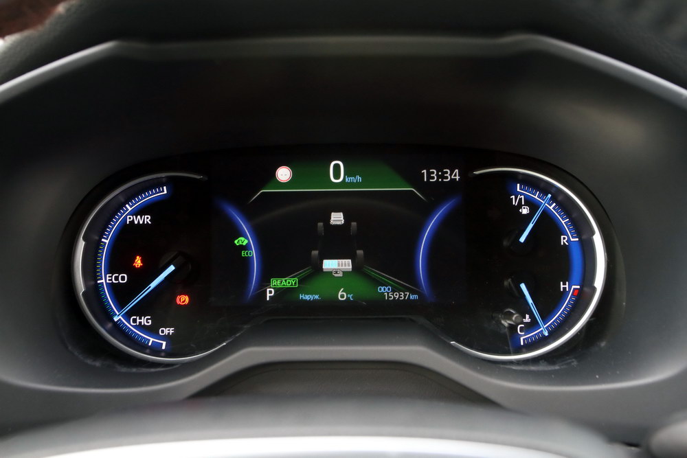 Даже в спортивном режиме RAV4 по полной использует электрику – и тоже при первой возможности отключает бензиновый мотор. Впрочем, скажу честно: сущности и необходимости этого спортрежима я не понял. Если педаль от души придавить, то «равлик» разгоняется с абсолютно одинаковой резвостью что в «эко», что в «спорте». Поэтому у меня есть веское предположение, что это чисто маркетологическая проделка и тонкий психологический ход: ваш автомобиль будет всё так же экономить топливо и беречь воздух, а вы будете тешить своё самолюбие, предполагая, что берёте от машины по максимуму.
