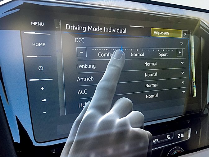 В прежней версии Пассата с активной подвеской DCC предлагали три предустановки (нормальную, комфортную и спортивную), теперь жесткость выбираешь виртуальным ползунком с массой промежуточных положений. Такая же тонкая настройка появилась полтора года назад на лифтбеке Volkswagen Arteon (ЗР № 7/2017).