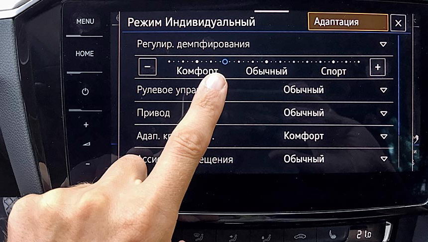 А вот на адаптивное шасси DCC не грех и раскошелиться. Теперь помимо пресетов Normal, Comfort и Sport имеется индивидуальный режим, в котором жесткость амортизаторов выбираешь виртуальным ползунком со множеством промежуточных положений.