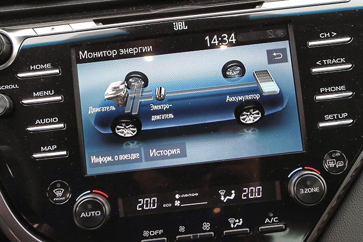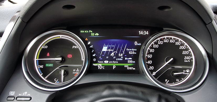 педали тормоза. На нее Toyota Camry Hybrid реагирует не так «прозрачно», как бензиновая версия: заметно участие мотор-генератора в процессе, особенно в начальной фазе, когда чувство мягкого сопротивления электрического двигателя на педали вдруг сменяется привычным ощущением результата труда тормозных колодок. Но привыкание проходит быстро, буквально за считанные дни, в течение которых, впрочем, стоит особенно внимательно следить за дистанцией до едущего впереди автомобиля.