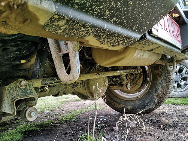 Вот участок со славной вязкой грязючкой. Ну-ка, неужели хотя бы здесь командор Ковалёв размотает свой трос да поддёрнет нас? Кстати, когда понадобится Джимника тянуть, то уже сразу из-под обоих бамперов с любопытством и готовностью выглядывают мощные петли, приваренные к раме. Но ни тросу, ни петлям, ни командору работы не нашлось: маленький самурай с истинно японскими упорством да изяществом прошёл зыбучую грязь на бодром ходу.