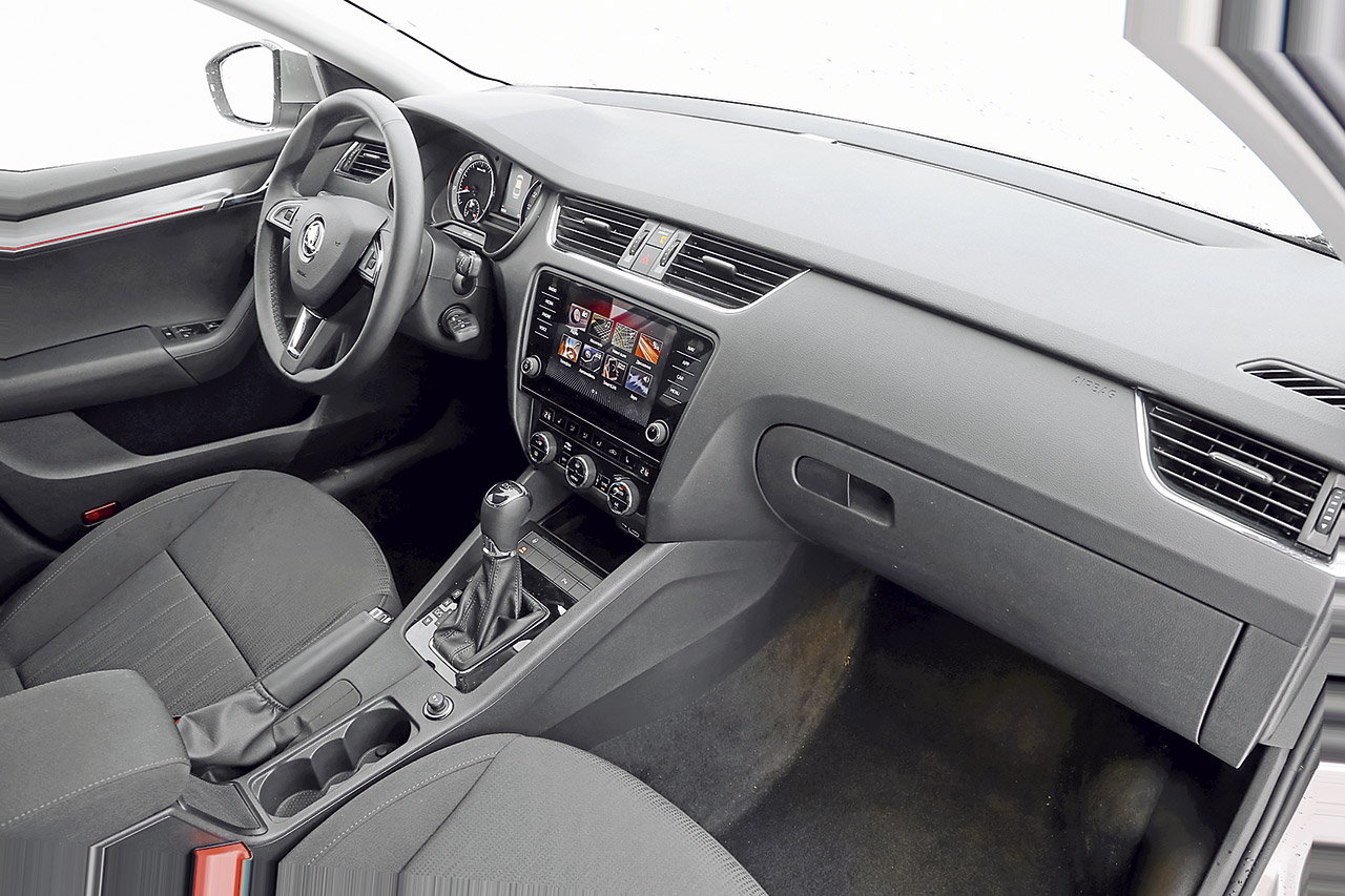 Градус премиальности в салоне Октавии ниже, хотя и не сильно. Здесь тоже есть контурная подсветка в дверях, классная мультимедийная система Bolero c восьмидюймовым тачскрином и индукционная зарядка для гаджетов. Skoda проще Фольксвагена в незаметных, на первый взгляд, мелочах: обычный ручник вместо электронного, нет шторки секции подстаканников, больше голого пластика слева от водителя. Но всё это ерунда на фоне пресного и невыразительного дизайна.