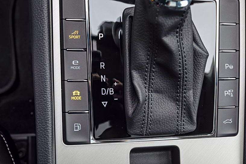 Лючок для зарядки – в решетке радиатора. Приборы – с указателем уровня заряда и расхода энергии. Пускаю двигатель, но в салоне тишина: в режиме e‑mode машина катится исключительно на электротяге. Селектором DSG можно не только переключать передачи, но и менять эффективность рекуперации. В самом интенсивном режиме Skoda резко замедляется под сброс – можно не пользоваться тормозами. Кстати, настройка педали тóрмоза характерна для многих гибридов: сначала пусто, а затем густо.