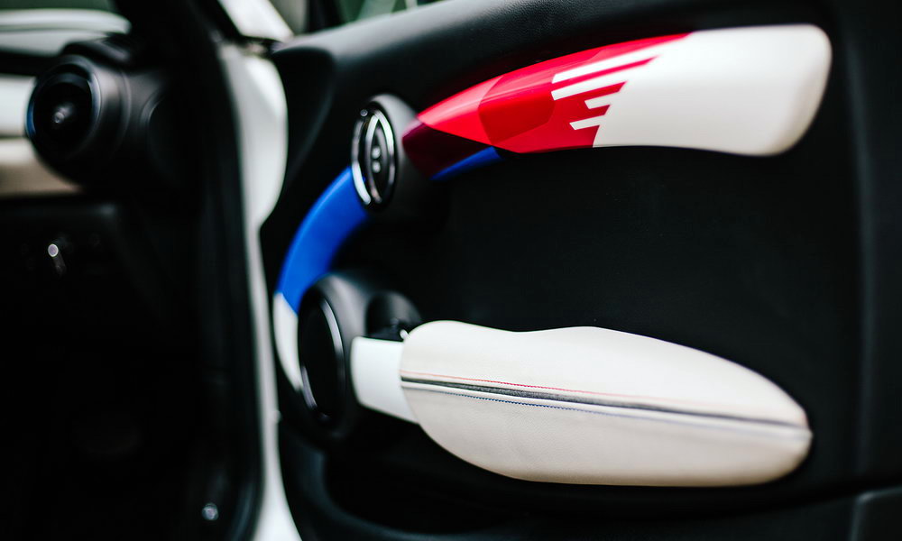 Главной особенностью «свадебного» хэтчбека является разноцветная крыша, расписанная вручную в несколько слоёв – графика сочетает в себе элементы флагов Великобритании и США. Кроме того, автомобиль получил напечатанные на 3D-принтере накладки на боковые поворотники с инициалами молодоженов и сердечком между ними, а при открытии дверей на асфальт проецирует светящаяся надпись «Just Married».